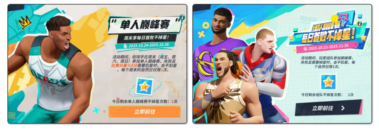 周五、周六、周日3天单人参加巅峰赛,失败且比分在5分之内,每天可享1次不掉星活动。同时自10月22日起,参加巅峰赛,每天组队可享1次不掉星活动。稳步冲段保持激情,超巨之路为你护航。