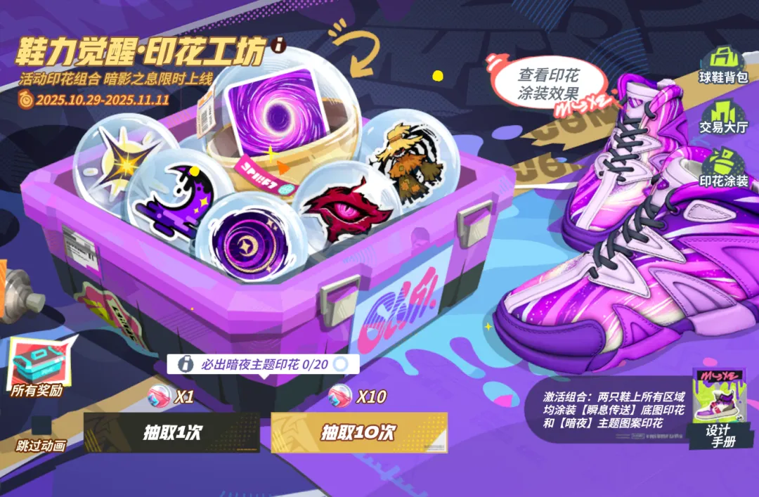 鞋力觉醒·印花工坊活动将于10月29日再次上线!截至11月11日,街球手进入活动页面使用印花解码蛋,即可参与暗夜主题印花抽奖!(最多20抽必得暗夜主题印花)