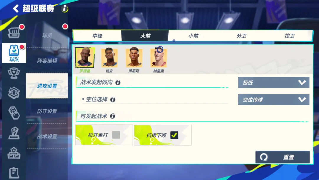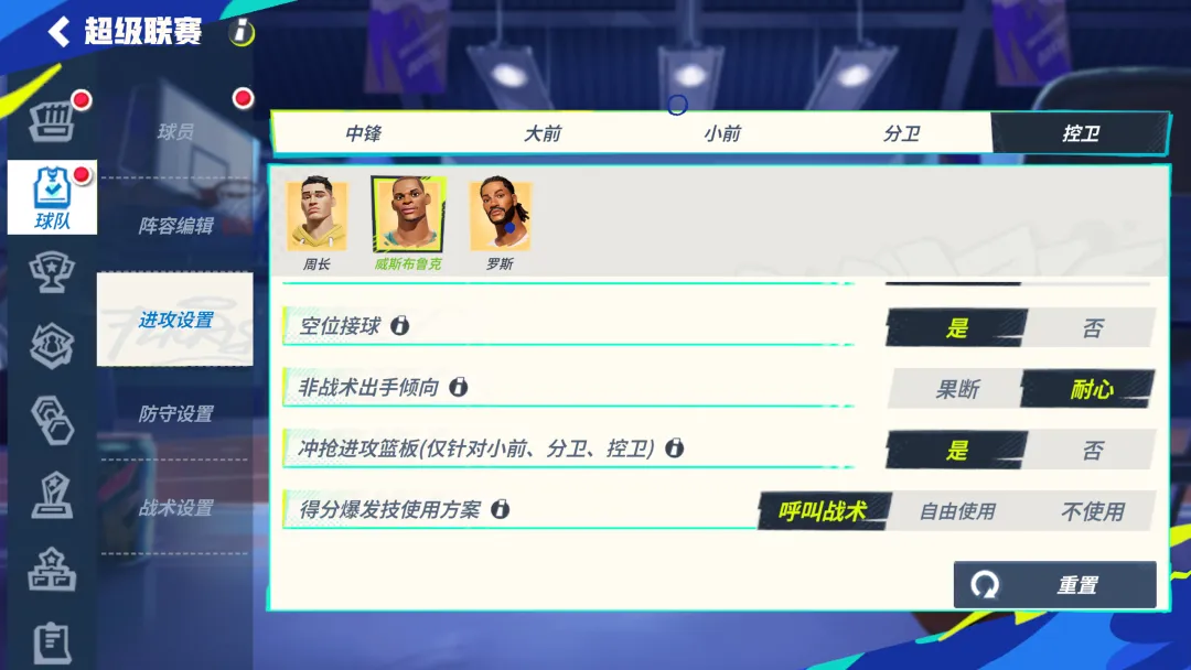 此外,攻防设置中小前、分卫、控卫均有冲抢篮板功能,推荐威少和维金斯之类具备冲板能力的非内线球员选择。还有空位选择功能,可以根据球员是否具备投射能力选择。